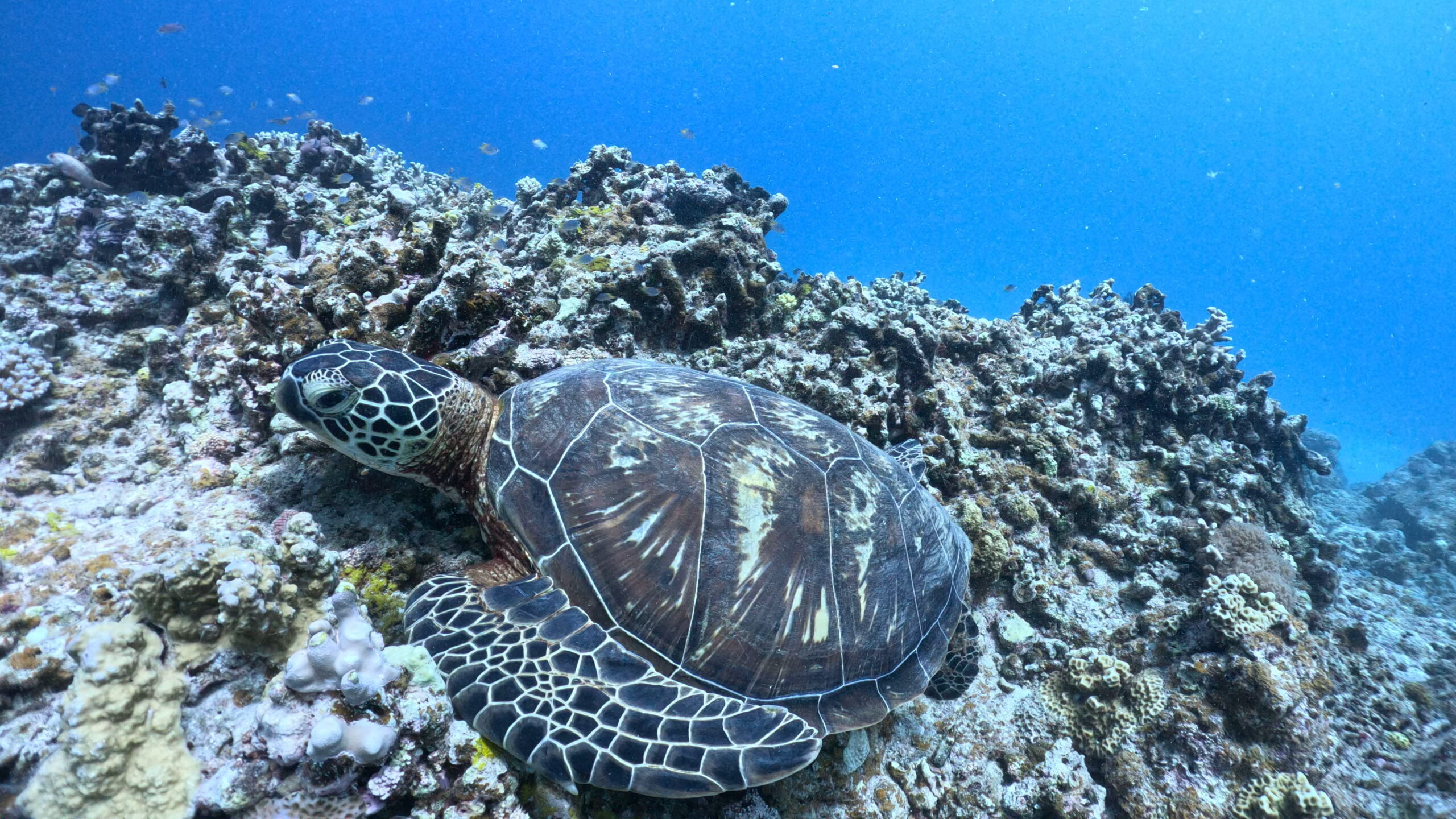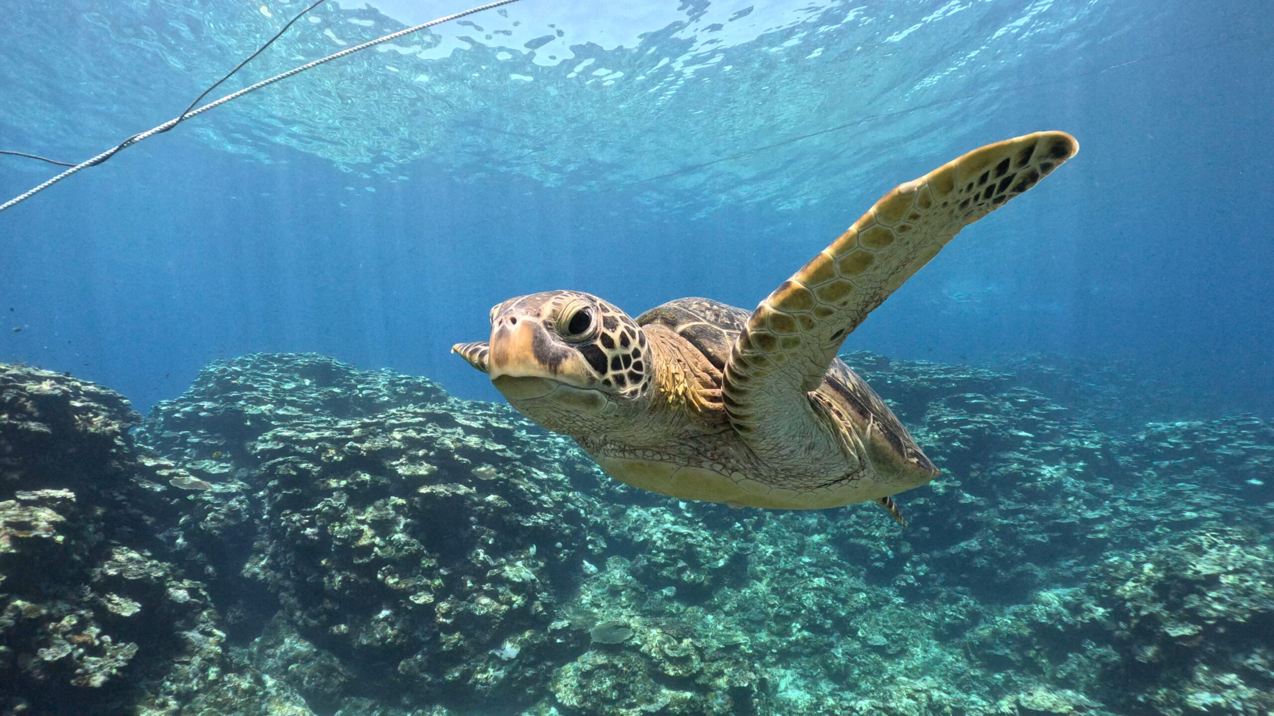 人懐っこいアオウミガメが真横素通りです。